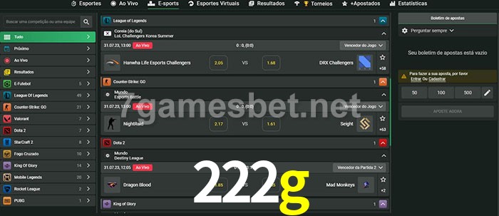 O 222g oferece uma grande seleção de opções de apostas em e-sports com probabilidades competitivas
